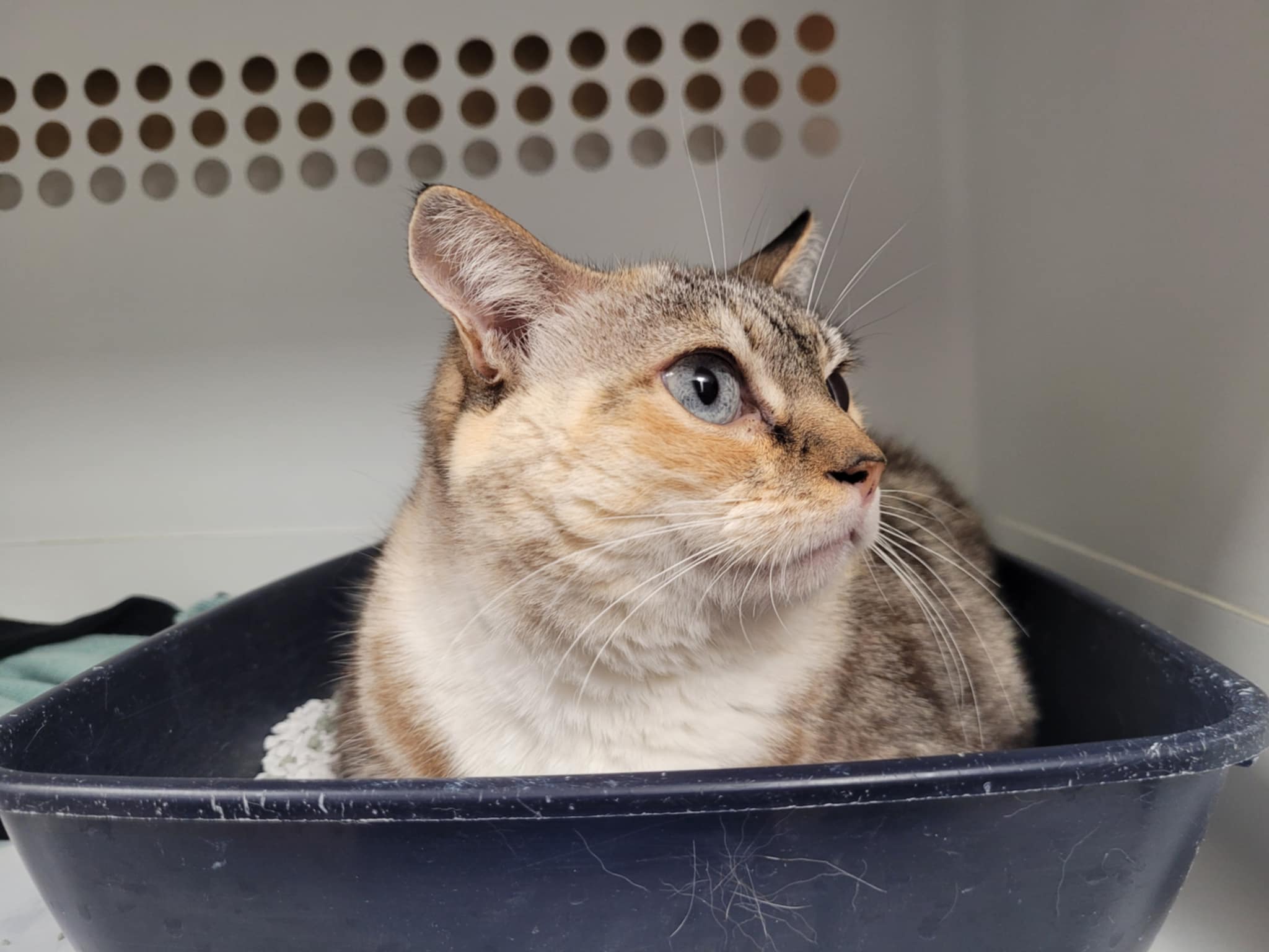 Chipie est une chatte en surpoids, et qui a donc des difficultés à se nettoyer l’arrière-train. Il sera donc important de surveiller qu’elle reste propre pour ne pas faire d’infection, quitte à lui faire tondre les fesses de temps en temps en attendant qu’elle perde du poids.