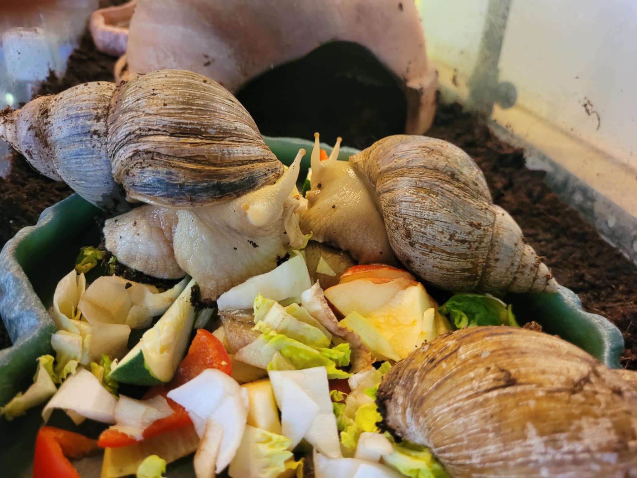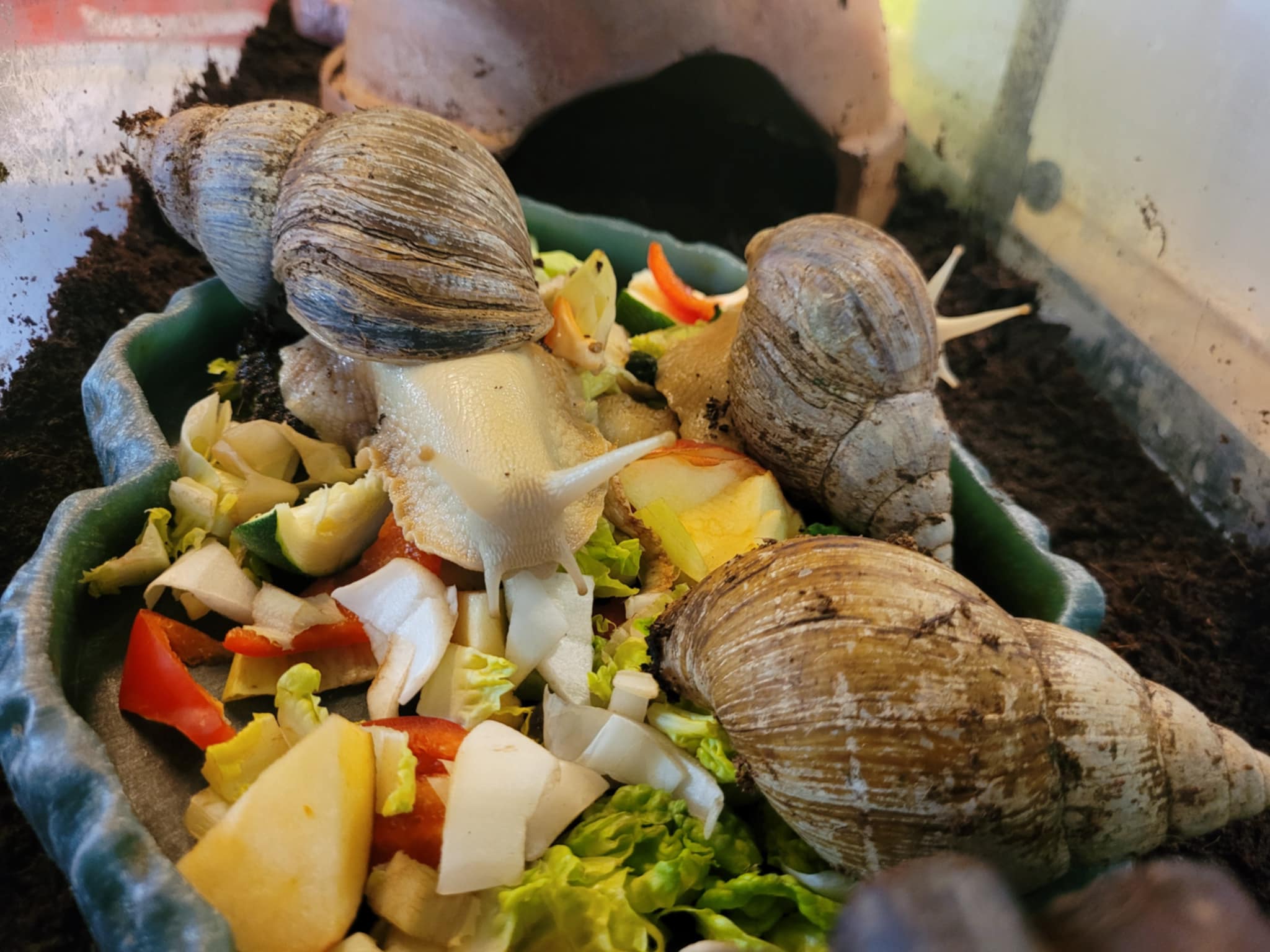 Ces escargots africains auront besoin d’un terrarium chauffé et humide pour de bonnes conditions de vie, et se nourrissent de fruits et légumes de façon quotidienne, ces animaux peuvent atteindre 30 cm de large au fil du temps. Des photographies de vos installations vous seront demandées avant de pouvoir envisager toute adoption.