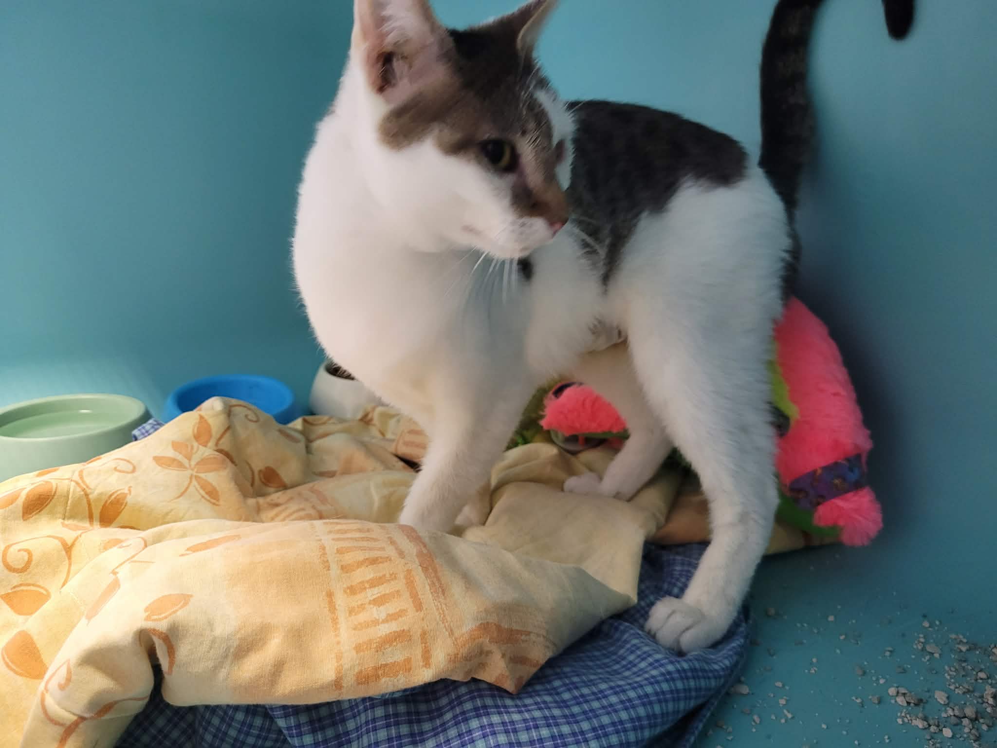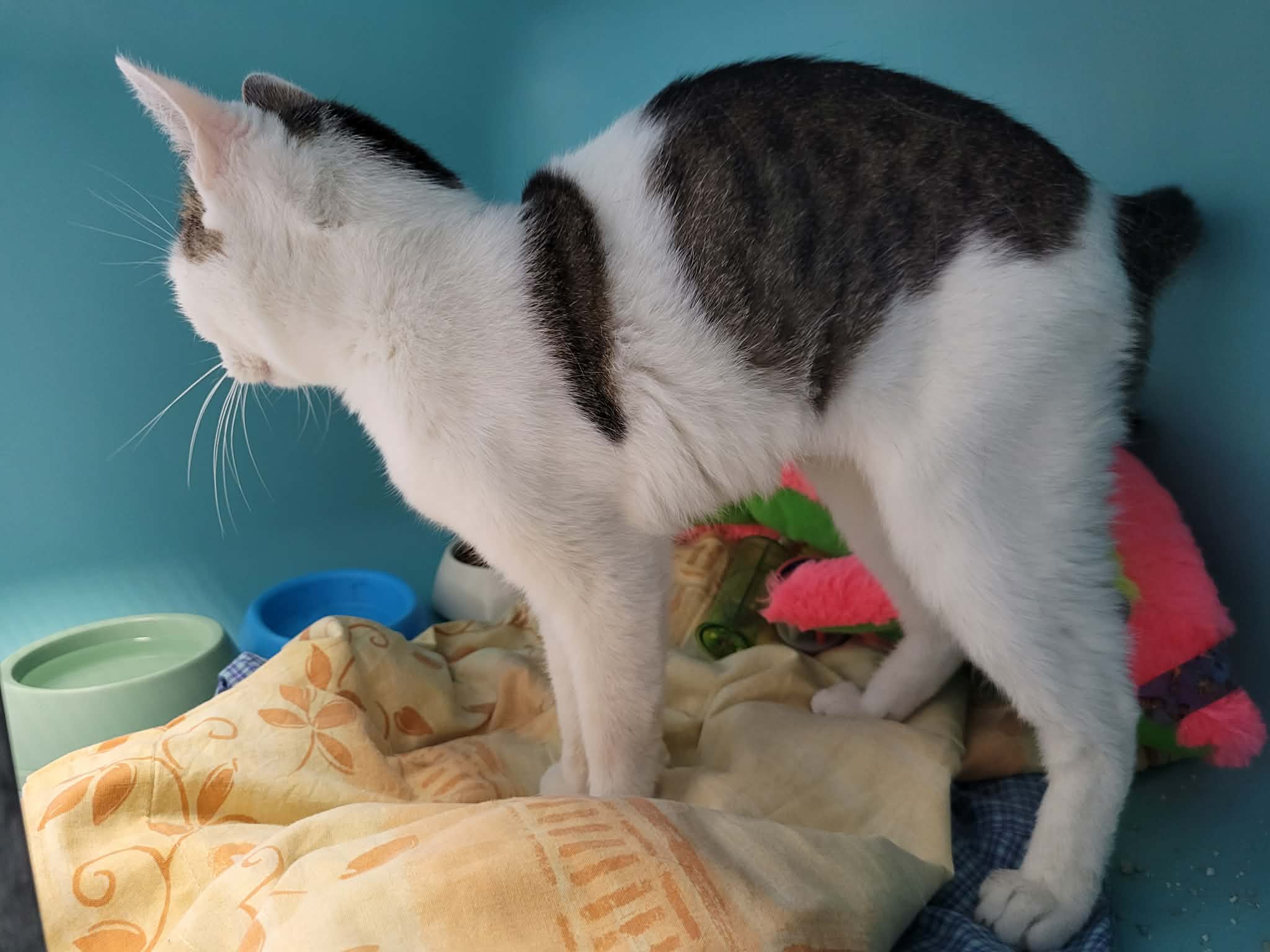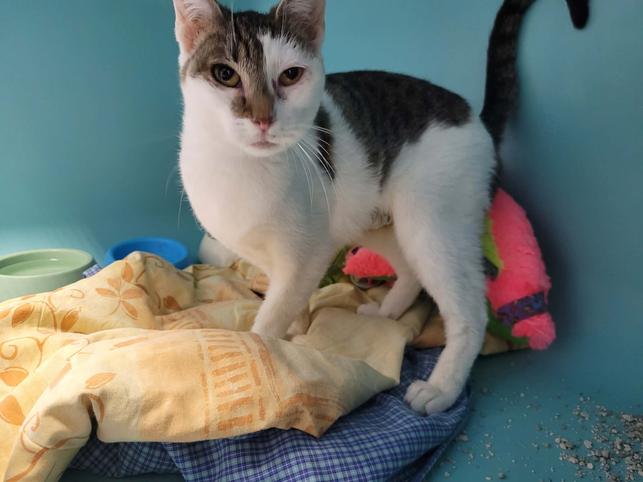 Hortensia est une minette assez chétive arrivée chez nous avec onze congénères, mais se montre déjà très affectueuse malgré son passé un peu compliqué. Néanmoins, en raison d’une existence un peu négligée, elle montre une santé un peu vacillante, qui, nous l’espérons, pourra s’améliorer une fois qu’elle sera dans un foyer plus stable dans lequel elle peut s’épanouir pleinement. Elle souffre actuellement d’une conjonctivite sous traitement, mais devrait s’améliorer rapidement.